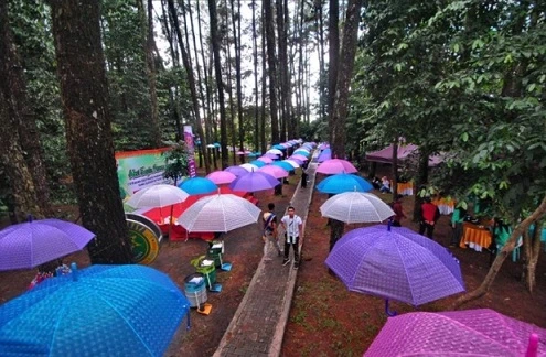 Begitu melangkah masuk, Kece People langsung disambut hamparan pohon pinus yang berdiri rapi, seolah melambai pelan tertiup angin. Cahaya matahari yang menembus sela-sela daun menciptakan suasana estetik—cocok buat healing tipis-tipis atau berburu foto kece.