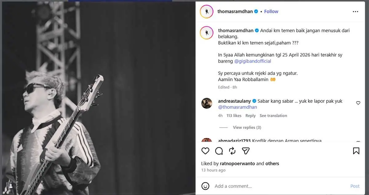 “Insyaallah kemungkinan 25 April 2026 hari terakhir saya bareng @gigibandofficial,” ungkap Thomas Ramdhan, Minggu (12/4).